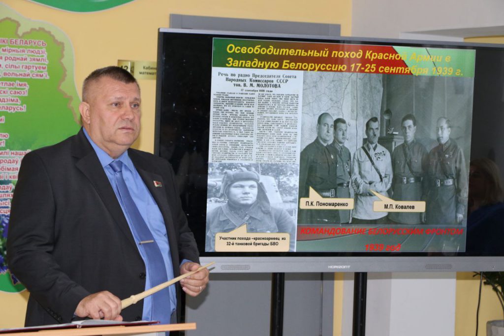В своем выступлении подполковник Александр Ровгач и подполковник запаса Олег Назаров раскрыли историю праздника, продемонстрировали архивные исторические документы сентября 1939 года, связанные с освободительным походом Красной армии в Западную Беларусь, поведали об объединении Западной Беларуси с БССР, когда сбылась многолетняя мечта белорусского народа жить в единой и дружной семье. Подполковник Александр Ровгач также рассказал о Вооруженных Силах Республики Беларусь, их развитии на современном этапе, о ССУ «Запад-2025» и завершил свое выступление сообщением о кузнице офицерских кадров – Военной академии Республики Беларусь.